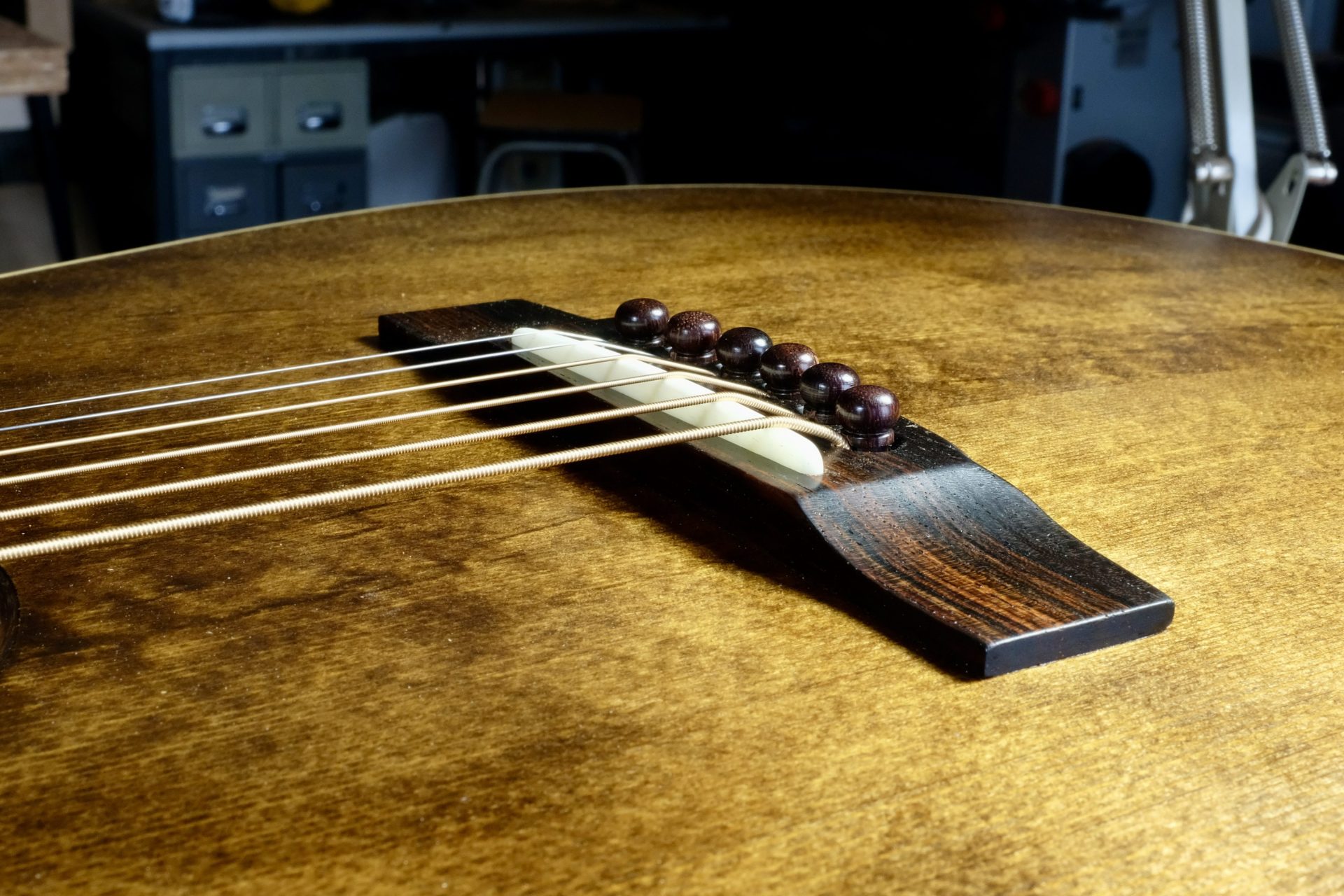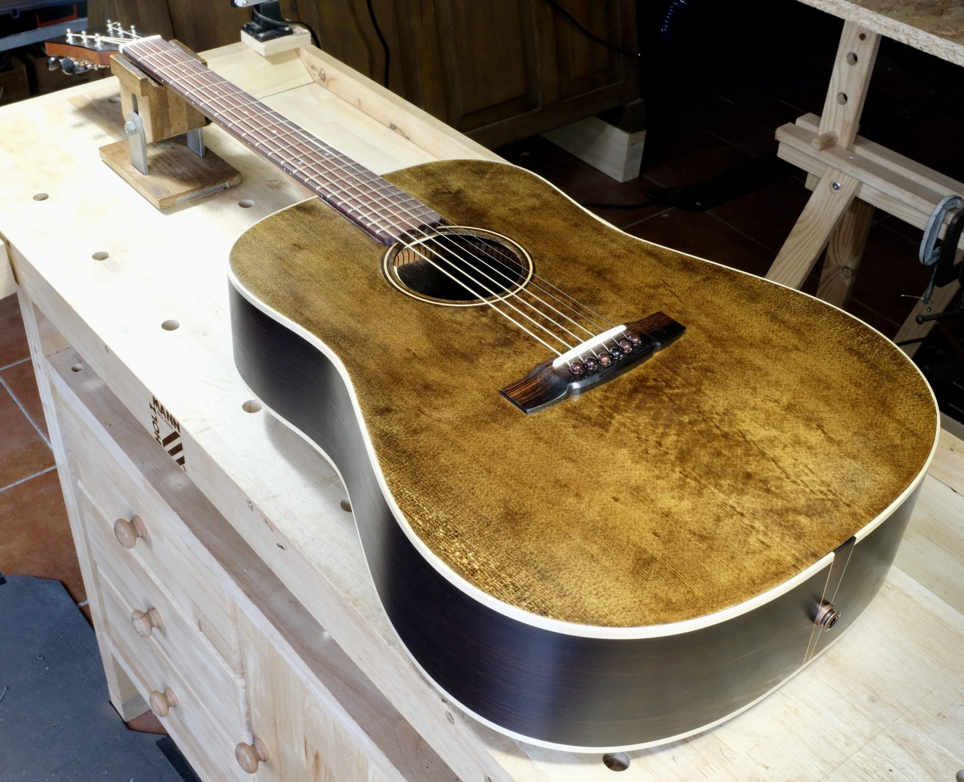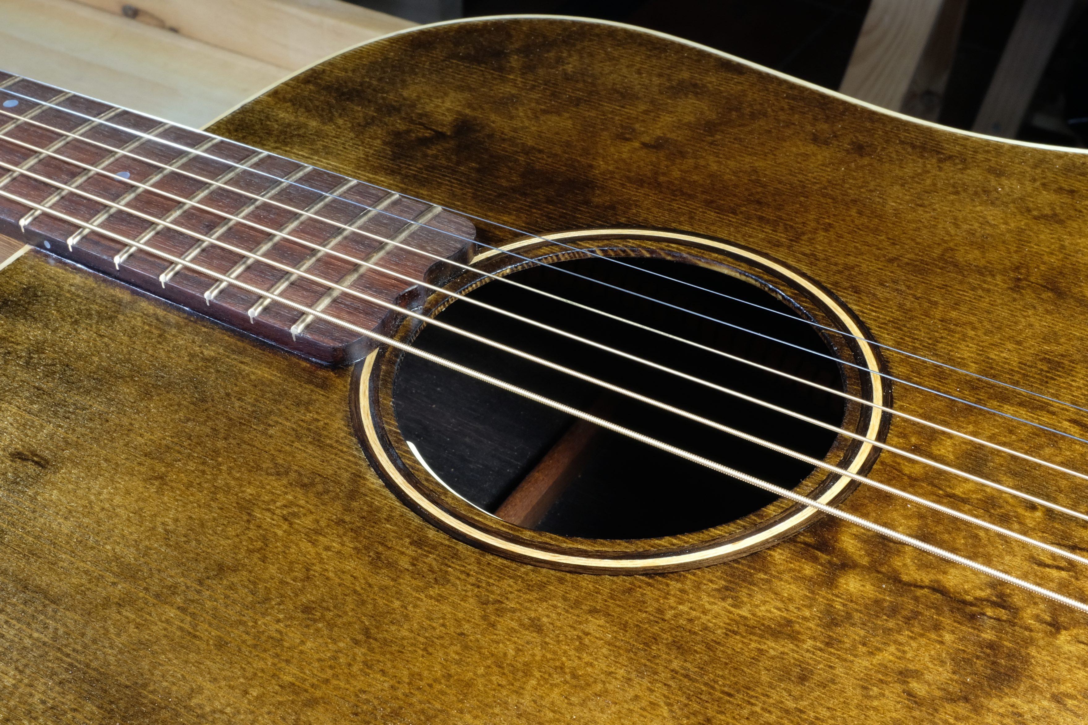 Finish: Varnish-oil and Hand Rubbed Black/Brown Burst on Guitar Body
